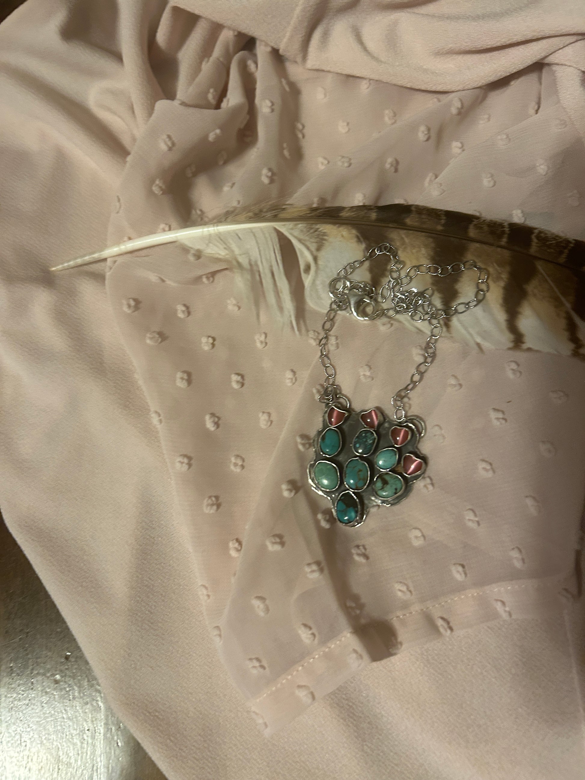 Turquoise stones with pink cat eye stones in sterling silver on a 16 inch sterling silver chain