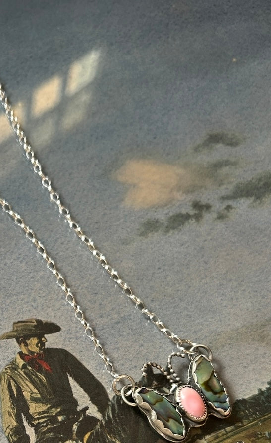 Rainbow abalone shell with pink conch necklace set in sterling silver on a sterling silver 16 inch chain